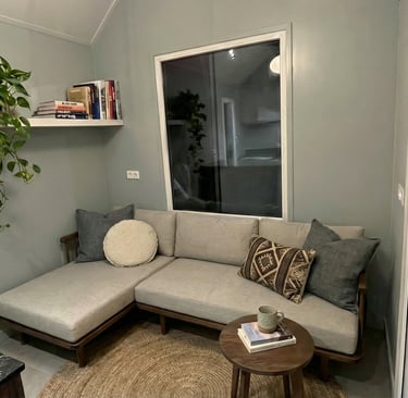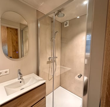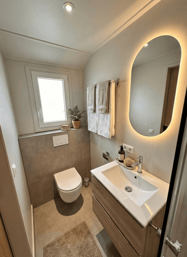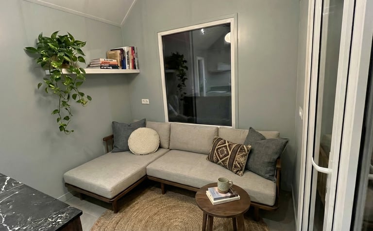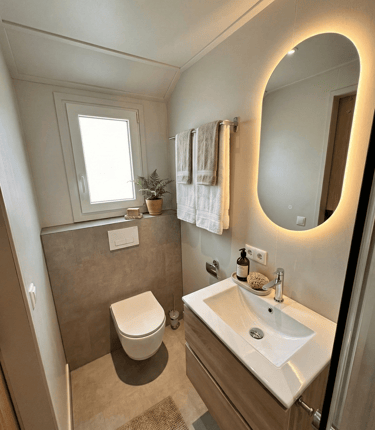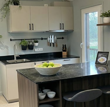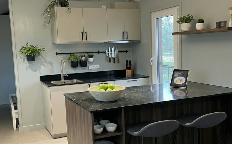 Het hart van de woning is de luxe keuken met kookeiland – uniek voor een Tiny House. Hier drinkt u 's ochtends uw koffie aan de bar en kookt u 's avonds uitgebreid met uitzicht op uw tuin.